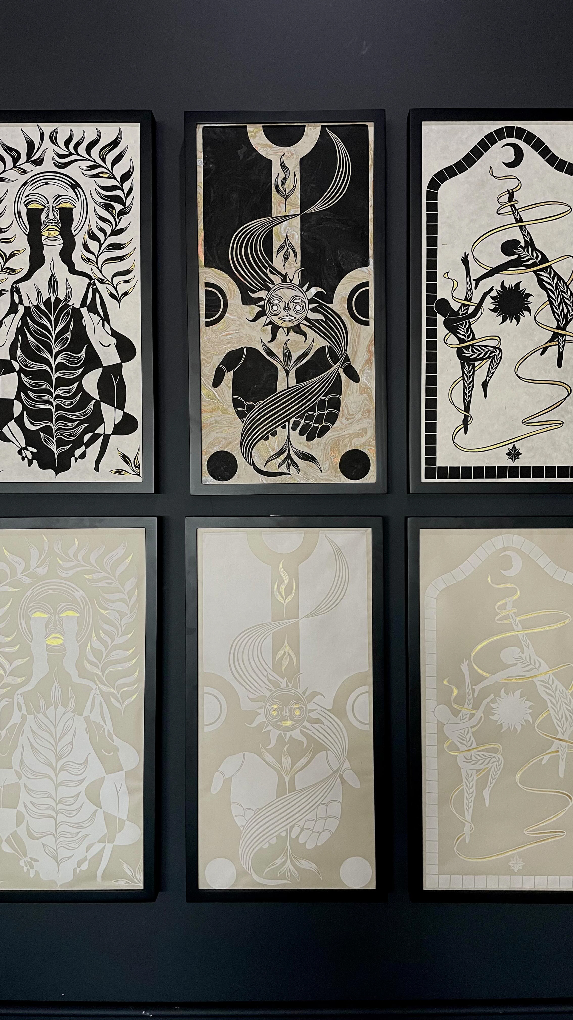 A six-piece collection of relief prints adorned with gold leaf accents. Inspired by tarot card art and symbolism, these works reflect on the connection between the heavenly bodies and us, the earthbound observers. It’s a beautiful, intertwined relationship — one where we depend on their yearly, monthly, and daily paths to shape our lives. From light to shadow, fortune to challenge, these prints explore our ever-present relationship with the cosmos.