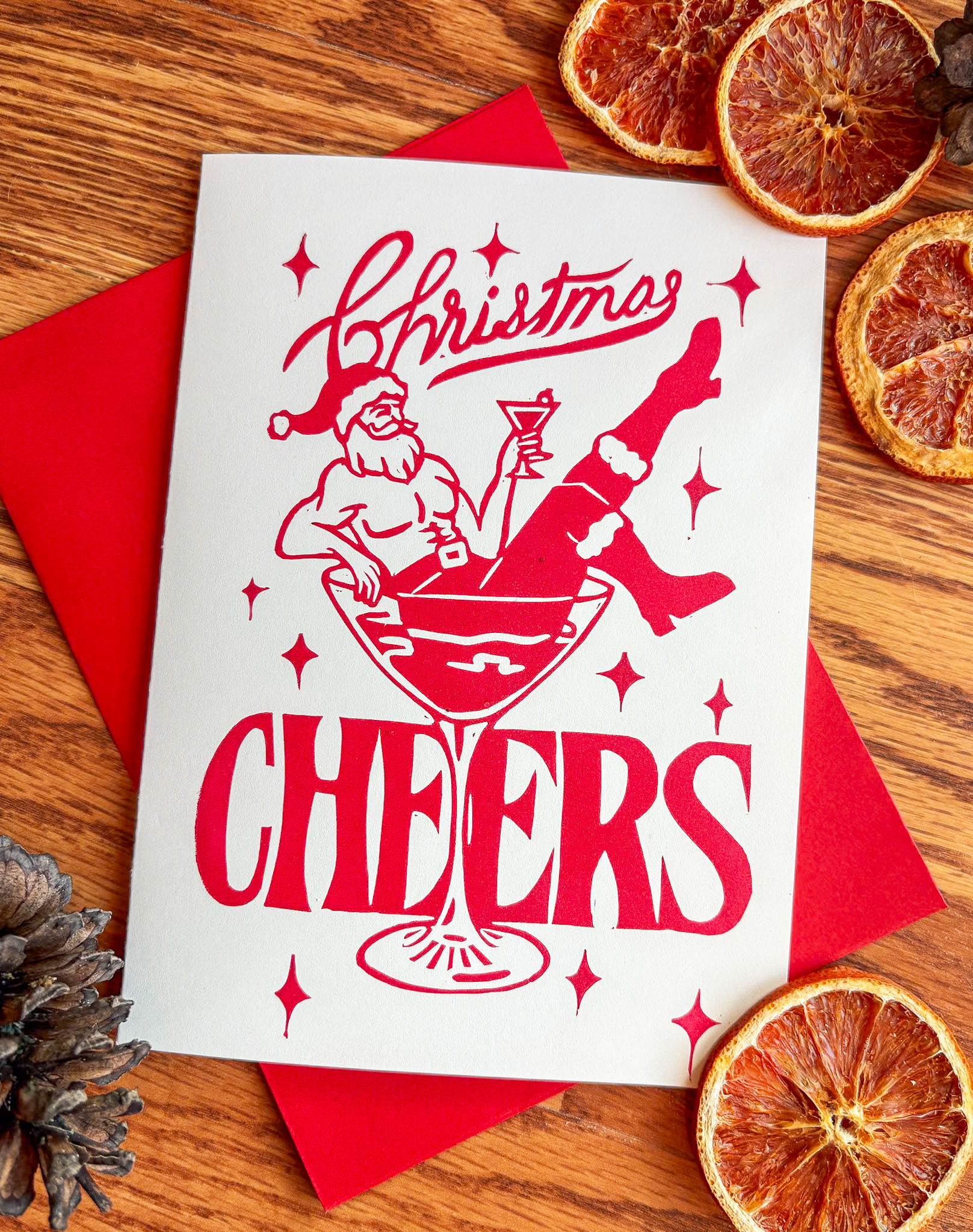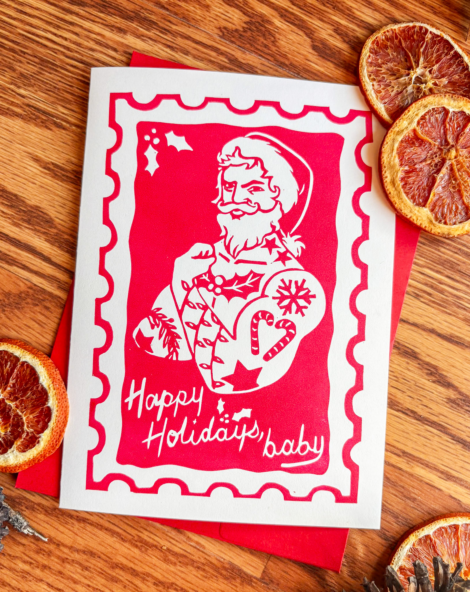 Hand carved designs of Santa. You've never seen him like this before. Linoleum carvings on card stock