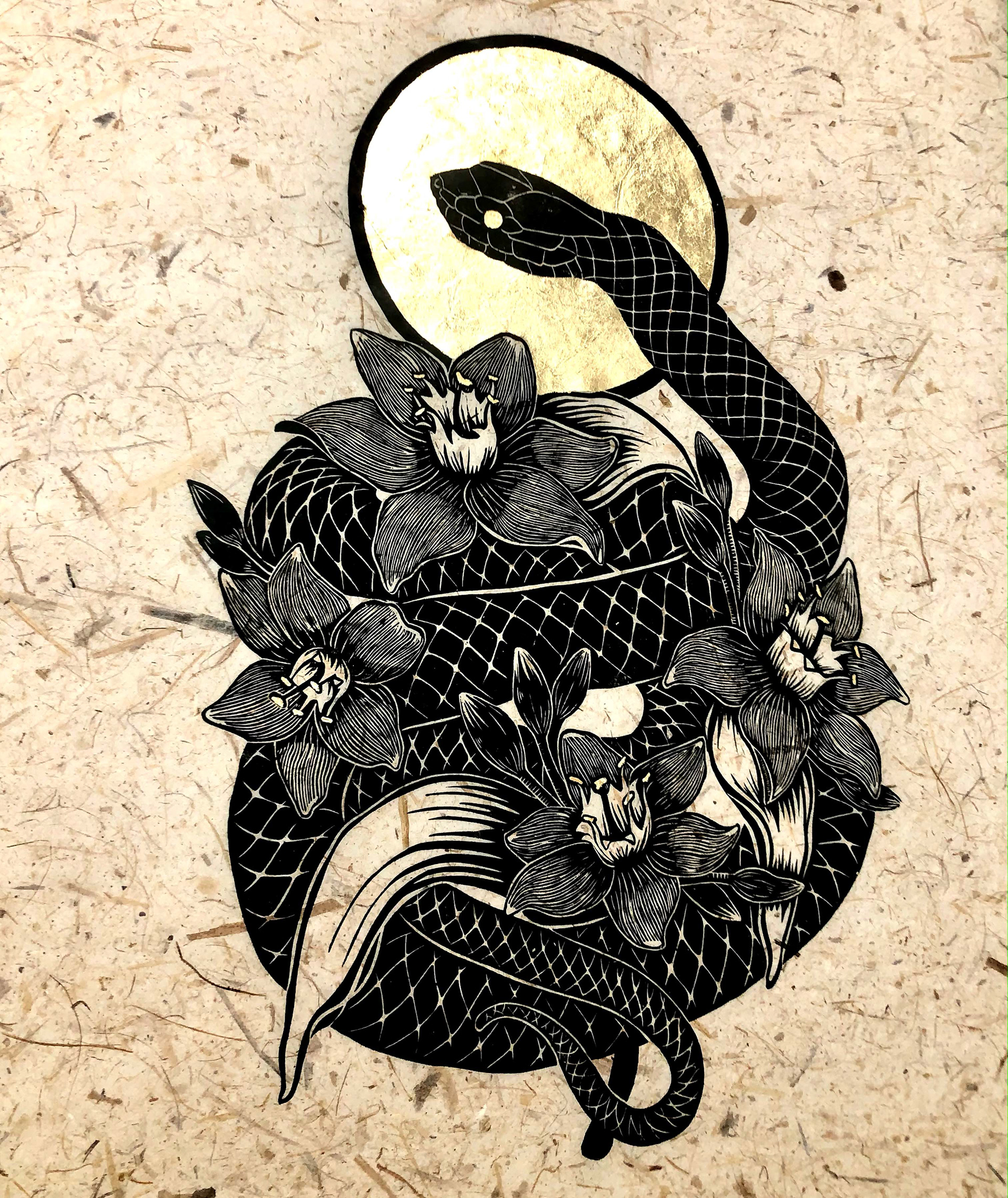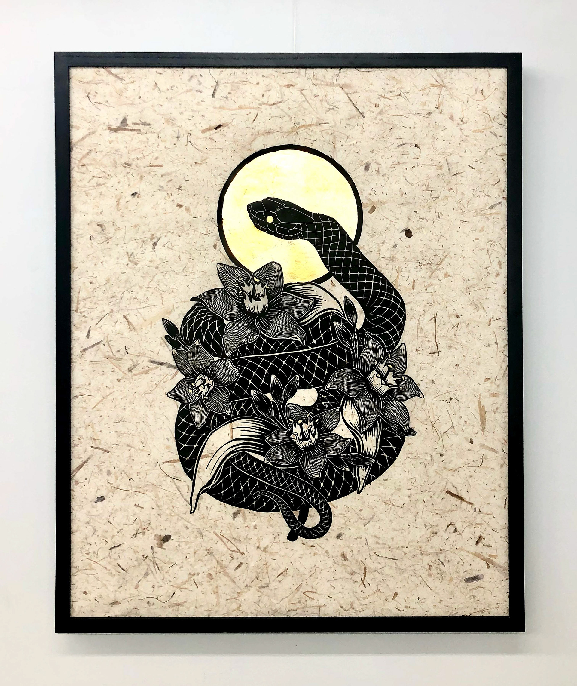 Peruvian Fishing snake surrounded by Amazon Lilies with gold leaf detailing. Relief print hand-carved and pressed onto handmade Thai banana paper. 30x24in
